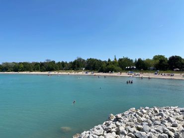 The area boasts a tranquil sandy beach right beside the lighthouse, complete with a playground, washrooms, a small harbour, and a boat ramp—ideal for families and water lovers